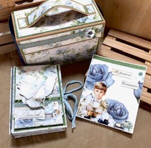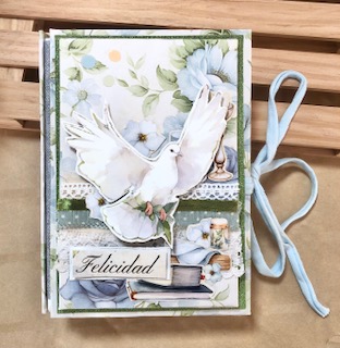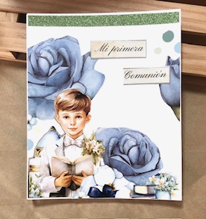 Este mes de mayo empezamos con una maletita tipo bolsa, un libro de firmas y un mini álbum dedicado a la comunión de niño usando la colección “Mi Gran día” de Scraperalyn.
